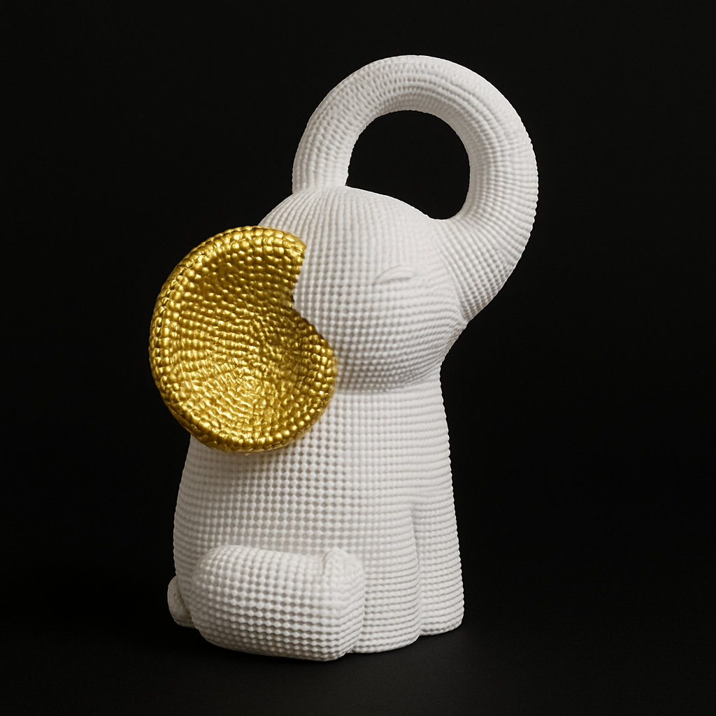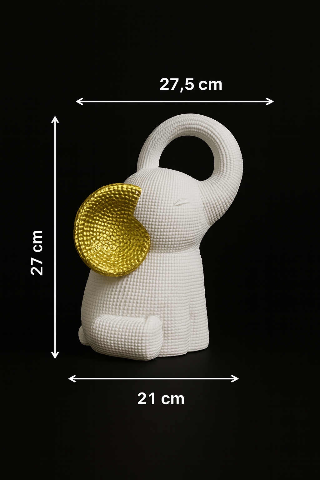 Un’elegante scultura in bianco puro con orecchio dorato, simbolo di prosperità, forza e saggezza. L’elefante con la proboscide alzata è da sempre considerato un potente portafortuna: attira energia positiva, protezione e abbondanza.